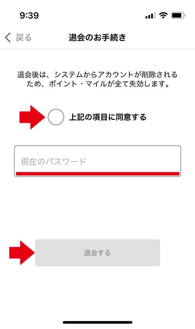 退会に関する注意事項をお読みいただき、ご承諾いただけましたら「上記の項目に同意する」をタップしてください。パスワードを入力し、「退会する」ボタンをタップで退会の手続きは完了です。